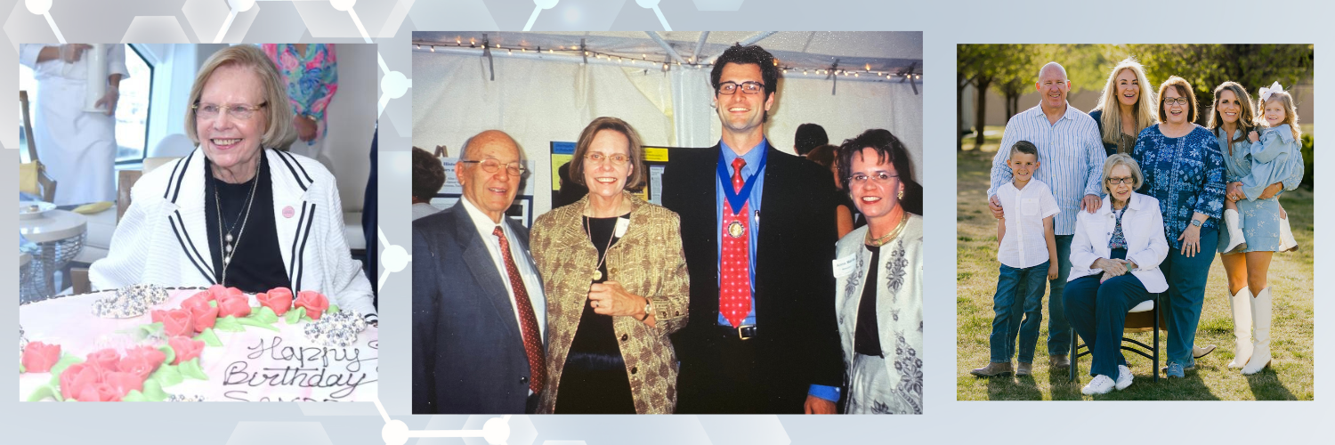 Row Three: 7. Sandra celebrating her 80th birthday 8. Sandra with ARCS Scholar Timothy Lant (3rd from Left) 9. Matteucci family