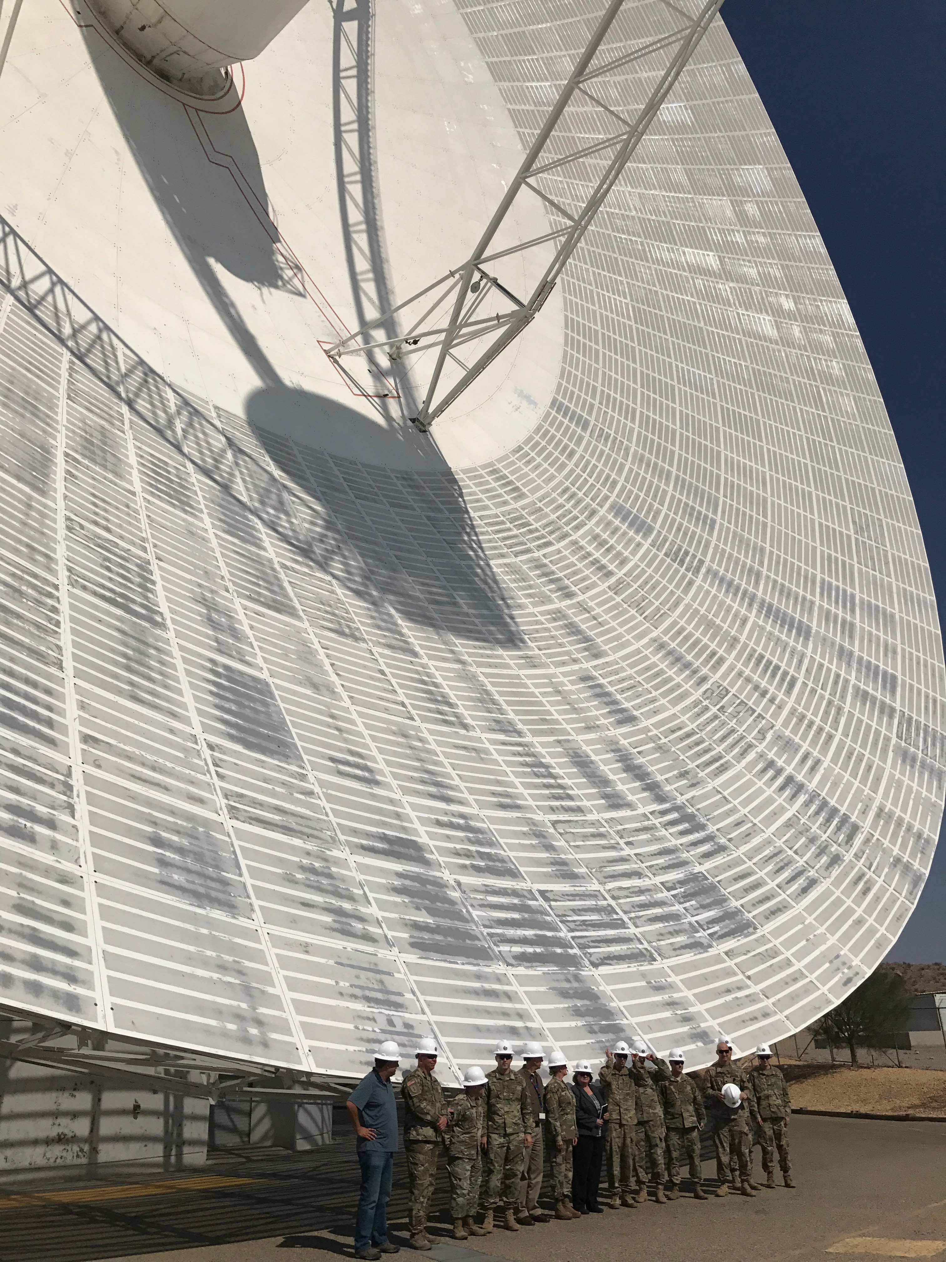 Army Personnel line up in front of NASA's 70 meter antennas to
