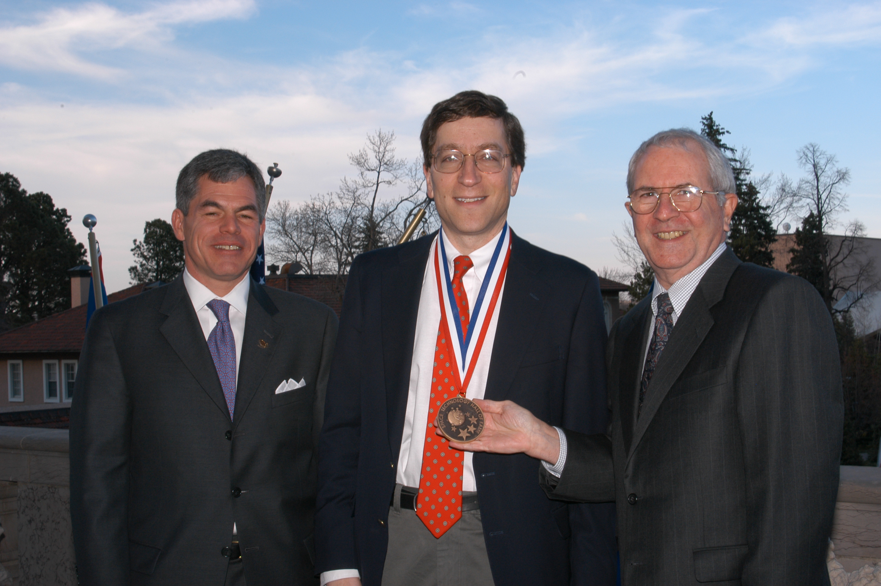 Dr. Stephen Lichten proudly shows off his medal while standing between